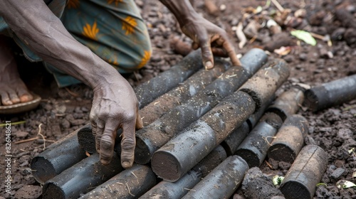 A worker expertly shapes a batch of peat briquettes by hand perfecting their cylindrical form.