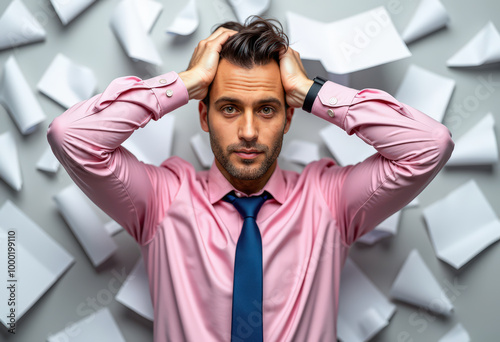 businessman, stress, paperwork, overwhelmed, office, frustration, work, worried, cephalalgia, job, pressure, tension, anxiety, corporate, pink shirt, document, chaos, professional, male, problem, challenge, desk, workplace, fatigue, overwork, suit, financial, tied-up, lifestyle, face, expression, emotion, adult, career, difficulty, stressful, business, deadline