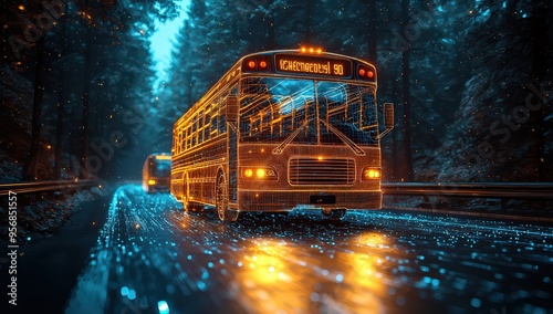 A yellow school bus made of digital data lines, driving on the highway in an abstract dark blue background with glowing lights.