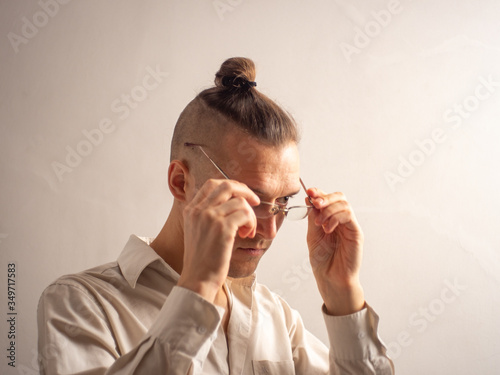 adjusting, adult, blond, care, casual attire, caucasian, closeup, clothes, concept, confident, eye, eyeglass, eyesight, face, bankruptcy, fashion, fashionable, gay, goggles, guy, photogenic, happy, hipster, holding, home, isolated, looking, male, man, model, 1, optical, people, person, portrait, relaxed, serious, shirt, sight, space, standing, studio, style, stylish, temple, vision, white, young, youngster
