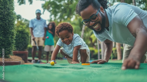 A young boy crawls playfully on the green while his father helps him with mini golf