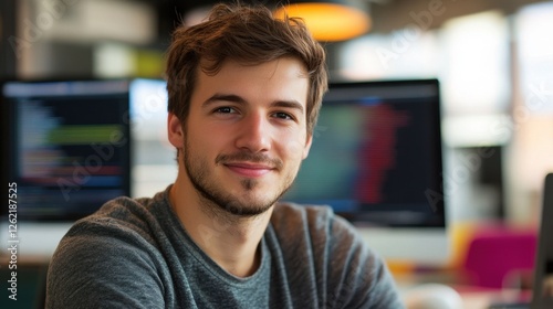 A young male software developer smiles confidently in a modern workspace. Surrounded by technology and screens, he embodies professionalism and creativity in his environment.
