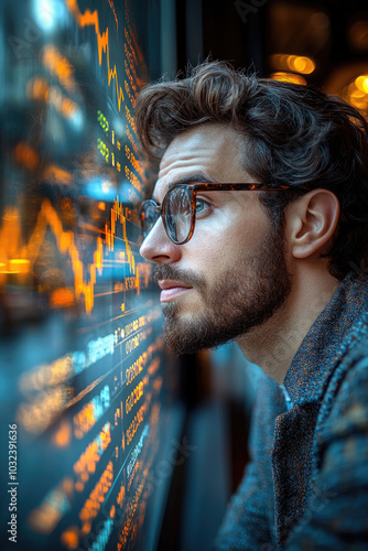 A young man with glasses gazes intently at financial charts and stock market data displayed on glass, reflecting his analytical engagement