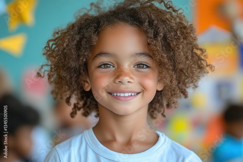 a young student with vibrant bouncing curls radiates joy in a sunlit classroom engaging with classmates amid colorful educational posters and floating paper airplanes