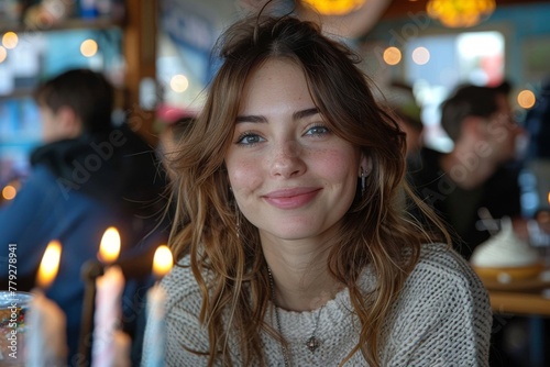 smile, woman, beauty, young adult, confident, happiness, relaxed, candid, lifestyle, casual attire, contemporary, indoor, eatery, cosy, natural, cheerful, joy, ambience, charming, friendly, face, attractive, casual clothes, content, elegance, glowing, leisure, person, positivity, pretty, serene, stylish, brunette, warm, living, peace, enjoyment, portrait