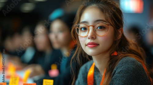 A young woman with glasses looks directly at the camera while sitting in a conference room with other attendees.