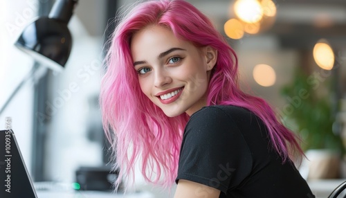 young, woman, vibrant, red, hair, to sit, desk, smile, participate, virtual, workspace, rehearsal, joyful, professional, mind, video, remote, laptop, technology, distance, computer, conference, happy, commitment, corporate, engage, office, connection, workplace, modern, interaction, lady, open, colours, contact, teamwork