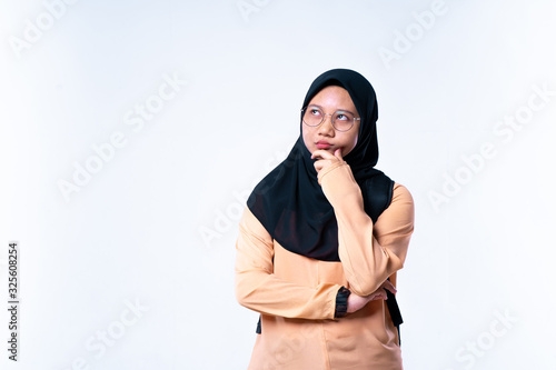 A young women thinking over an idea. Attractive thinking teenager, student. On a white background.