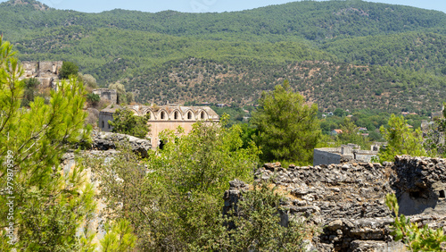 Abandoned Catholic church in abandoned town or village Kayakoy, neighbourhood of municipality and district of Fethiye, Mugla Province, Turkey