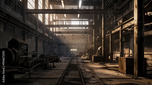 abandoned, industrial, warehouse, sunlight, window, rust-eaten, machinery, track, nostalgic, eerie, atmosphere, old, factory, decay, urban, exploration, vintage, grunge, empty, building, architecture, interior, light, shadow, history, forgotten, derelict, metal, structure, workshop, equipment, steel, beam, dust, grime, neglected, rustic, retro, mechanical, workplace, storage, manufacturing, production, industry