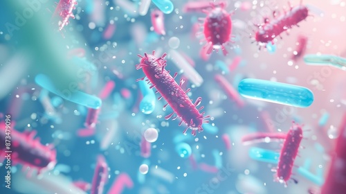 Abstract bacteria, probiotics, gram positive bacteria bacteria and viruses of various shapes against a light background. Concept of science, medicine. Microbiology background. 3d illustration