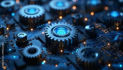 Abstract blue gear and computer chip background, technology concept with gears on a circuit board