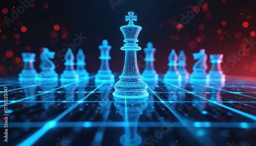 chess, strategy, game, competition, leadership, business, board, king, piece, technology, abstract, digital, neon, concept, battle, futuristic, ai, innovation, network, intelligence, success, light, glow, plan, decision, smart, future, design, art, team, solution, process, control, winning, online, risk, challenge, creative, idea, graphic, illustration, development, analysis, structure, datum, element, matrix, modern, grid, cyberspace
