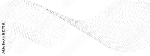 Abstract flowing dots particles wave curved lines on transparent background. Black halftone gradient smooth curve line shape background. Design for frequency sound, technology, science, banner. Vector