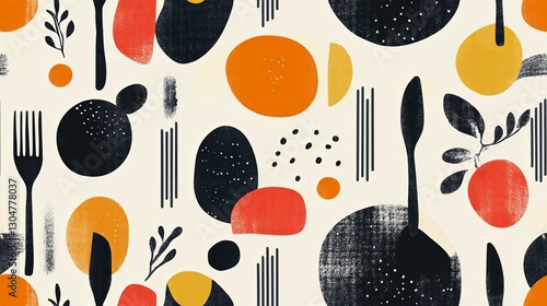 abstract, art, background, beige, black, circle, cutlery, design, dot, element, food, fork, fruit, geometric, graphic, illustration, knife, leaf, modern, orange, pattern, red, shape, seamless, simple, texture, vintage, white, yellow