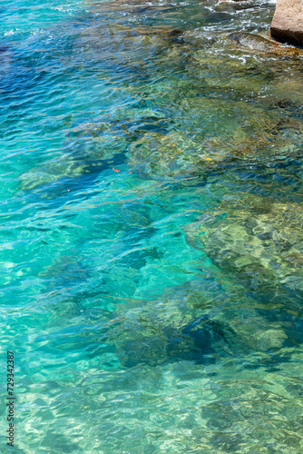 Abstract image of the contrast between the turquoise water and the rocks of Praia do Aventureiro, a tropical paradise in Ilha Grande, Angra dos Reis, Rio de Janeiro, Brazil.