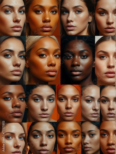 Abstract orange theme collage of diverse inclusive human woman faces art design illustration from Generative AI
