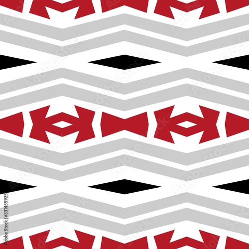 Abstract seamless white, red, black, grey pattern with ornaments and zig zag stripes. Modern background