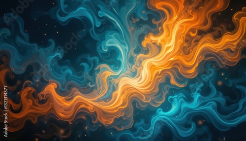 abstract, swirling, orange, blue, hue, colours, texture, pattern, background, design, art, digital, artistic, illustration, graphic, vibrant, dynamic, energy, motion, flow, wave, curve, line, fluid, liquid, paint, ink, mixing, blend, contrast, dark, light, glow, shimmer, spark, fantasy, cosmic, nebula, space, style, modern, contemporary, artwork, image