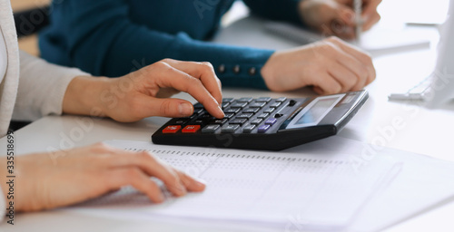 Accountant checking financial statement or counting by calculator income for tax form, hands closeup. Business woman sitting and working with colleague at the desk in office. Tax and Audit concept