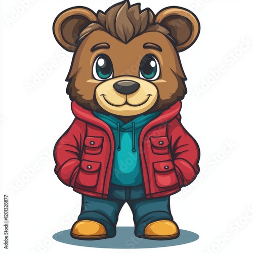 bear, cartoon, adorable, cute, winter, outfit, red, jacket, hoodie, jean, brown, fur, eye, big, small, happy, smiling, friendly, playful, charming, cosy, warm, stylish, fashion, apparel, clothing, footwear, boot, shoe, yellow, teal, blue, pocket, buttons, graphic, illustration, design, character, mascot, image, art