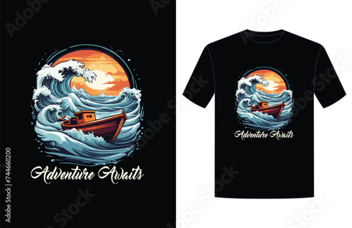 Adventure awaits t shirt design with a small boat riding the crest. Vector graphic for t-shirt prints, posters and other uses. Typography t shirt design