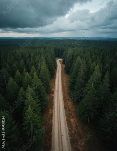 road, forest, aerial, nature, landscape, tree, sky, path, way, drone, view, travel, journey, adventure, countryside, rural, green, pine, wilderness, moody, cloudy, wood, dramatic, remote, dirt road, gravel, empty, destination, storm, dark, direction, perspective, freedom, escape, solitude, overhead, up high, background, evergreen, coniferous, nobody, outdoors, high, topview, timberland, unpaved, taiga, mountain, horizon, scenic