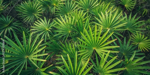 Aerial Macro Photography of Lush Saw Palmetto Leaves - Drone View of Tropical Foliage, Nature's Patterns, and Textures in Vibrant Green Hues for Nature Enthusiasts and Eco Lovers