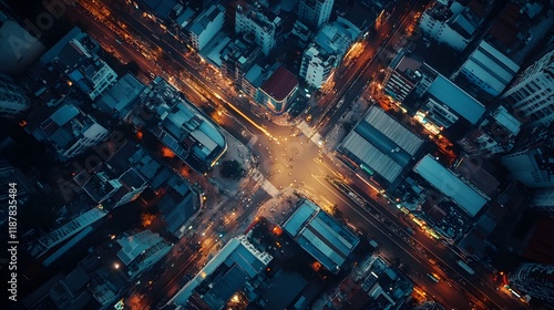 city, night, aerial, view, intersection, illuminated, street, urban, city landscape, building, traffic, car, light, road, metropolis, skyline, perspective, overhead, transportation, infrastructure, architecture, urbanism, development, concrete, asphalt, vehicle, motion, blur, energy, vibrant, dynamic, modern, complex, density, population, society, community, life, activity, movement, flow, network, connectivity, global, earth