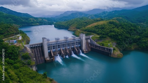 Aerial shot of a dam with water turbines generating electricity, set in a serene mountain environment