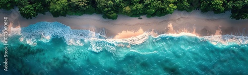 Aerial view of a beach with a wave crashing on the sand, travel concept, banner, copy space