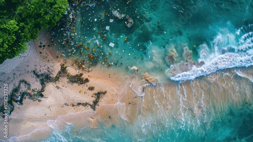 beach, ocean, wave, water, sand, shore, coast, coastline, blue, turquoise, green, white, foam, sky, aerial, view, drone, nature, landscape, environment, pollution, plastic, trash, debris, litter, problem, impact, ecological, environmental, conservation, protection, marin, life, ecosystem, planet