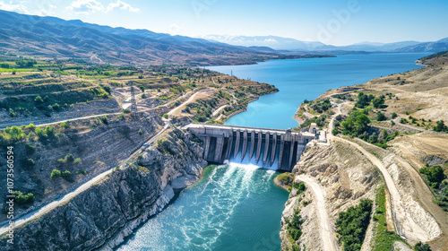 dam, water, flow, mountain, river, aqueduct, power, plant, energy, station, aerial, landscape, blue, sea, natural, scenery, rural, environment, scenic, view, engineering, construction, nature, mountain, reservoir, turbine, green, vegetation, rocky, terrain, clear, sky, management, renewable, electricity, generation, infrastructure, production, system, perspective, panoramic, wilderness, resource, ecological