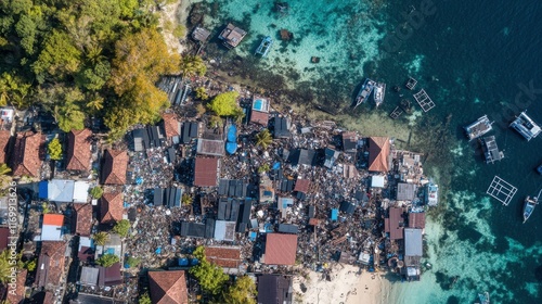 aerial, view, fishing, village, waste, discarded, boat, house, bright, midday, sun, water, coast, nature, scene, landscape, environment, habitat, ecology, shoreline, clutter, material, ocean, distance, vegetation, urban, community, rural, structure, tour tourism, activity, pollution, debris, cleanup, coastal, summer, tropical, travel, city landscape, coastline, natural, scenery, blue, clear