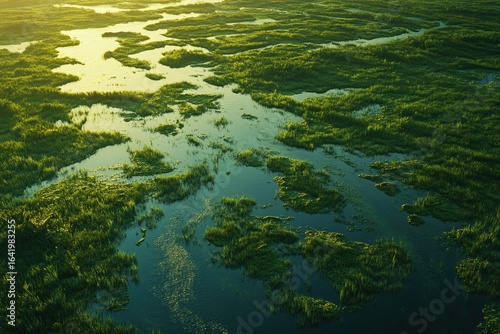 marsh, swamp, wetland, bog, water, grass, reed, plant, aerial view, nature, landscape, environment, ecosystem, wildlife, bird, sun, sunrise, sunlight, green, lush, vegetation, flooded, biodiversity, conservation, tranquil, serene, peaceful, scenery, photo, image, picture, beautiful, picturesque, stunning, amazing