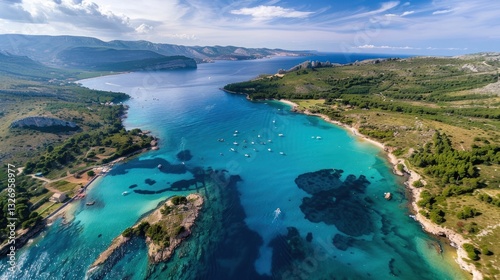 Aerial View of a Serene Coastal Bay with Turquoise Waters and Boats