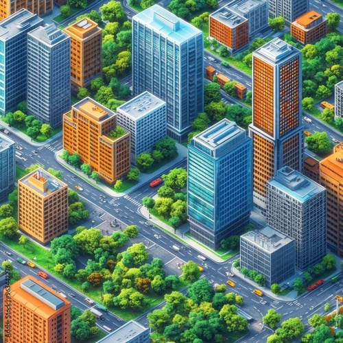 city landscape, building, city, skyscraper, highrise, urban, modern, architecture, concrete, glasses, steel, street, road, traffic, car, tree, green, park, parkland, foliage, overhead, aerial, perspective, view, downtown, metropolis, horizon, landscape, development, urbanism, design, infrastructure, neighbourhood, community, environment, nature, sunlight, sky, day, summer, painting, bright, vegetation, intricate, colourful, form