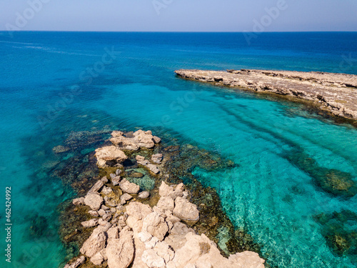 Aerial view on clear blue water of bay in Mediterranean Sea. Cyprus
