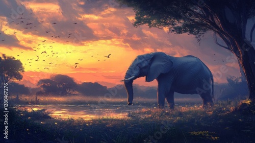 elephant, sunset, african, savanna, wildlife, nature, animal, landscape, wild, africa, photo, sky, orange, gold, hours, evening, light, serene, calm, peaceful, tranquil, majestic, powerful, large, herbivore, mammal, beautiful, scenic, digital, art, painting, illustration, artistic, creative, image, picture, photo, fantasy, dreamlike, bush, horizon, waterhole, bird, silhouette, trunk, tusk