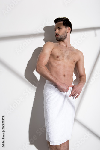 After bath. Serious bearded muscular topless guy is standing with towel on his hips and looking aside thoughtfully. Geometric shadows on the wall. Beauty concept