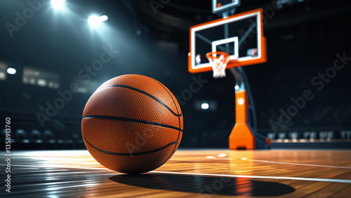 AI Generative. Image realistic basketball court scene with a close-up of a textured, orange basketball resting on the polished wooden floor., a basketball hoop with a transparent backboard. 8