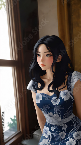 窓辺の青い服の女 AI画像 ジェネレーティブAI
