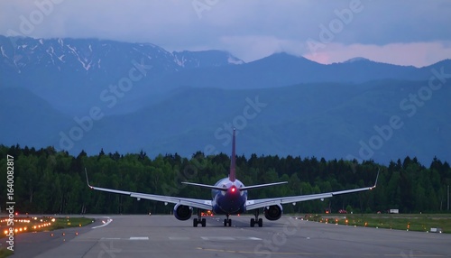 aeroplane, runway, dusk, mountain, forest, sunset, flight, evening, horizon, aerodrome, travel, transport, landscape, nature, passenger, commercial, jet, wing, tail, landing, take-off, blue, green, white, snow, cloud, light, dark