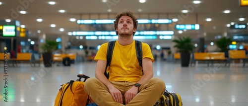 Airport Waiting, Traveler Sitting with Luggage, Delayed Flight.