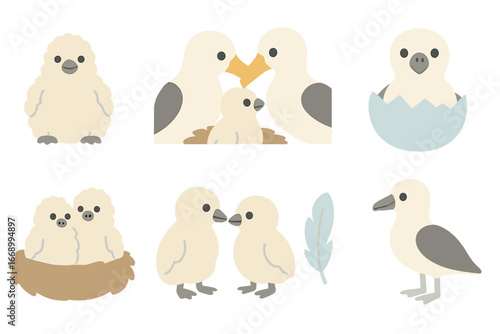 Albatross Family Icons. Flat vector mini-illustrations albatross chicks in colors children's illustrations: fluffy chick, feeding