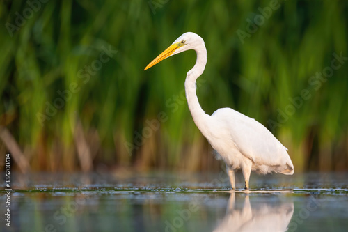 Alert great egret, ardea alba, standing water with green blurred background in summer nature. Elegant large bird looking on surface in wetland from low angle front view with copy space.