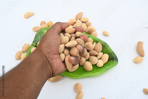 Almond with shell. It's other name Prunus amygdalus and Prunus dulcis. The almond is also the name of the edible and widely cultivated seed of this tree. indian almond.