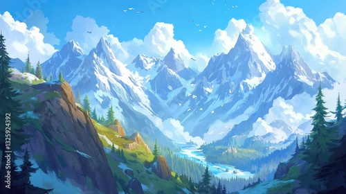 mountain, vale, landscape, scenic, nature, peak, snow, river, forest, tree, cloud, sky, blue, vibrant, colours, vista, travel, adventure, serene, peaceful, picturesque, gorgeous, amazing, beauty, fresh, air, fresh air, sunlight, summit, view, alpine, gorgeous view, mountain chain, winter, spring, summer, digital artwork, illustration, painting, travel destination, hiking, camping, exploration, explore