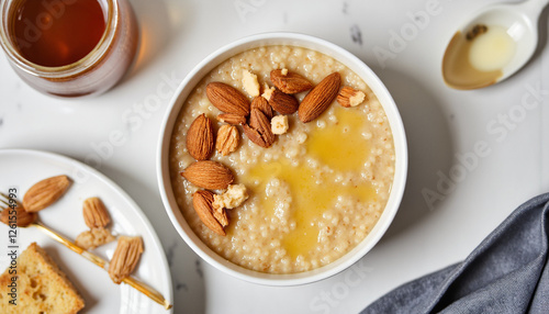 Amaranth porridge with honey and almonds in cozy kitchen, comfort food