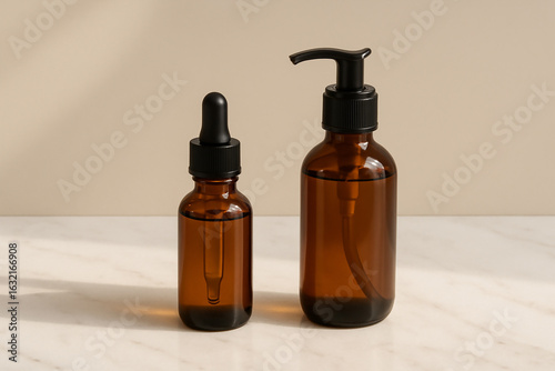Amber Beauty Duo: A pair of amber-colored glass bottles, one with a dropper and the other with a pump dispenser, stands on a textured surface.